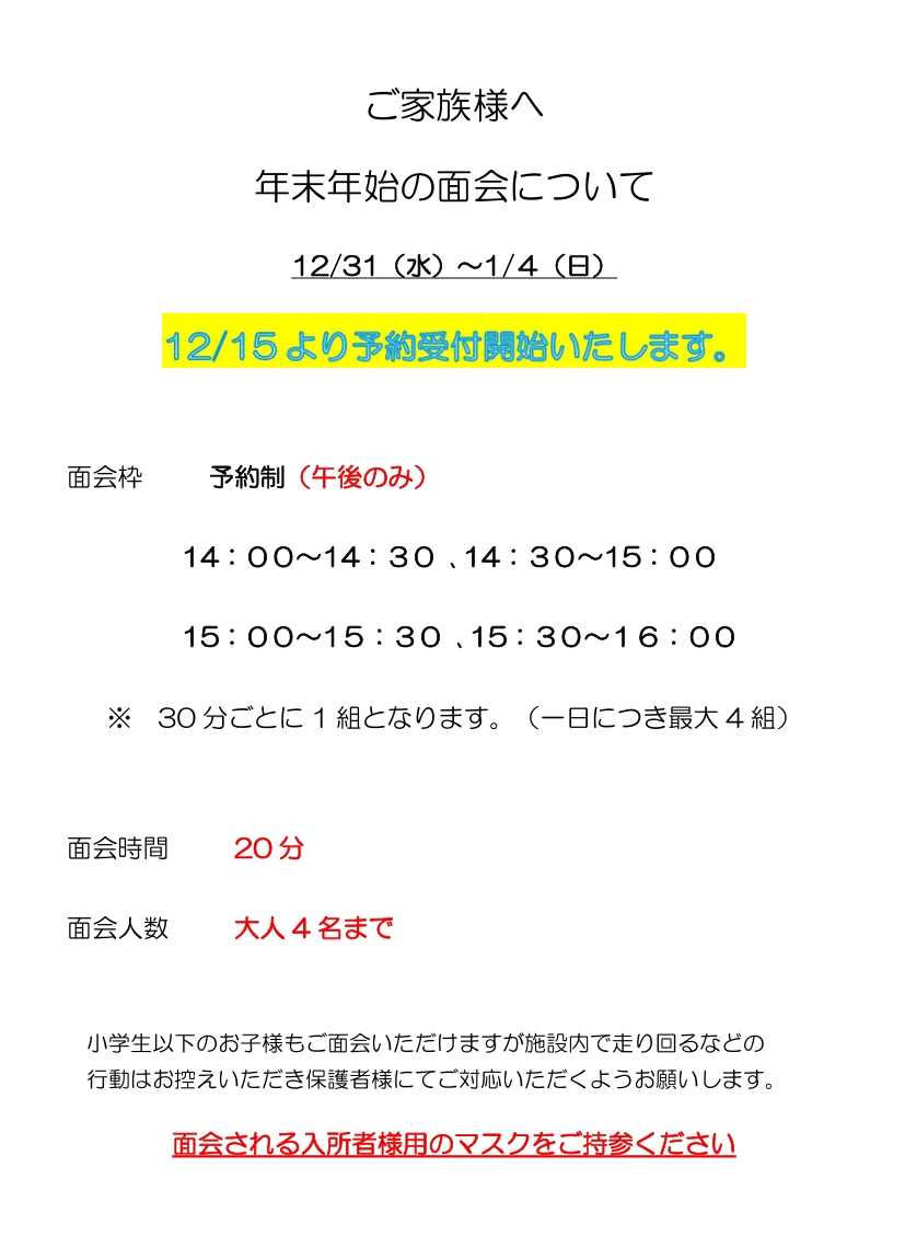 年末年始の面会につきまして、下記の通りご案内いたします。